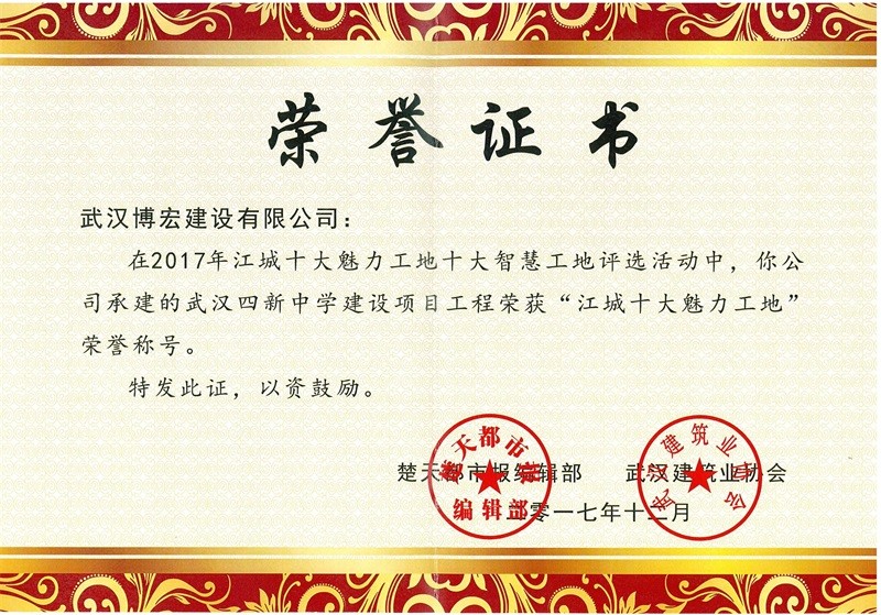 結(jié)構(gòu)優(yōu)質(zhì)工程證書(shū)(武漢四新中學(xué)教學(xué)樓)