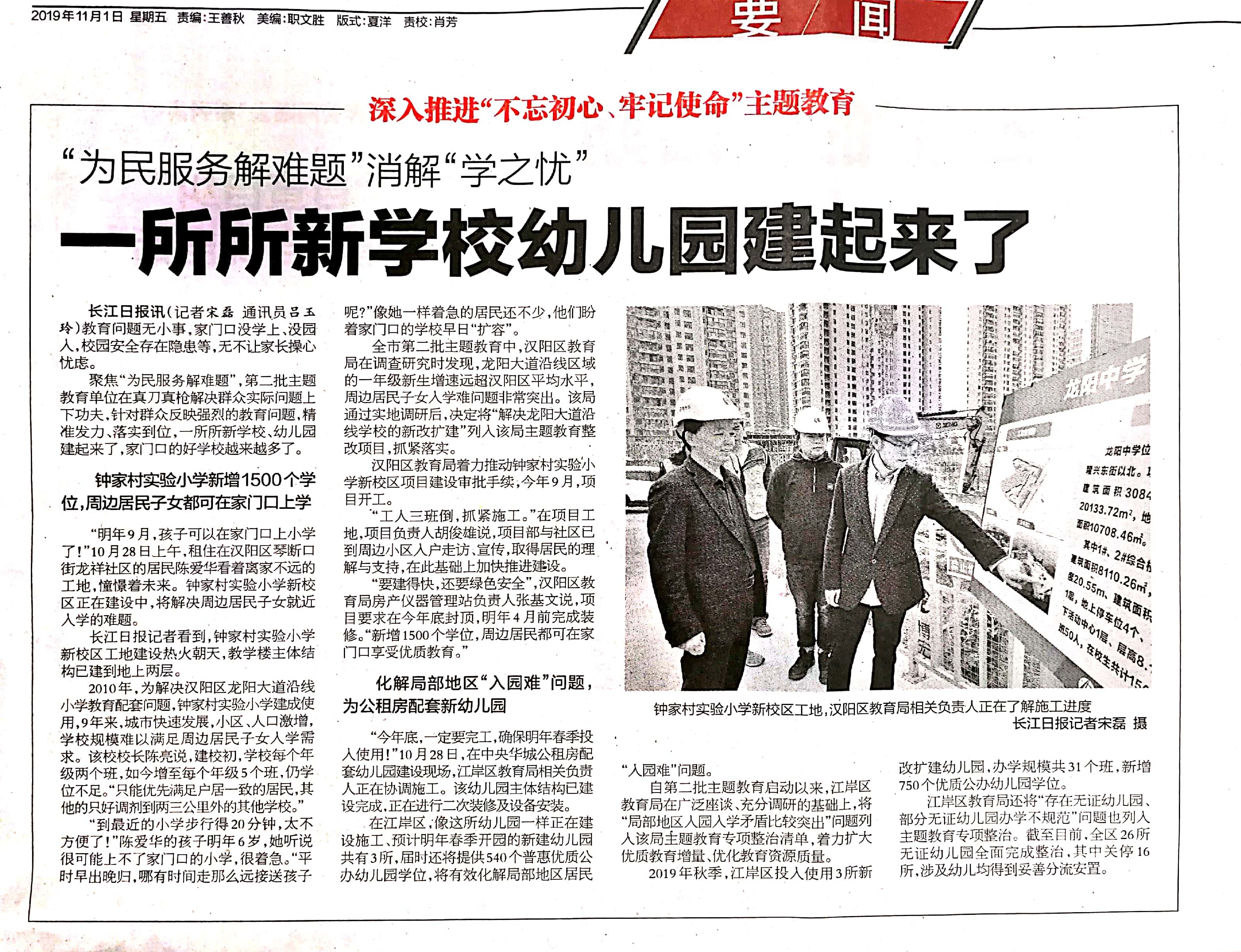 ?????????11月1日,《長江日報》以“‘為民服務解難題’消解‘學之憂’—一所所新學校幼兒園建起來了”為題,專題報道了龍陽中學項目(該項目建成后3—5年將作為鐘家村實驗小學新校區(qū)使用)的在建情況和建設意義。