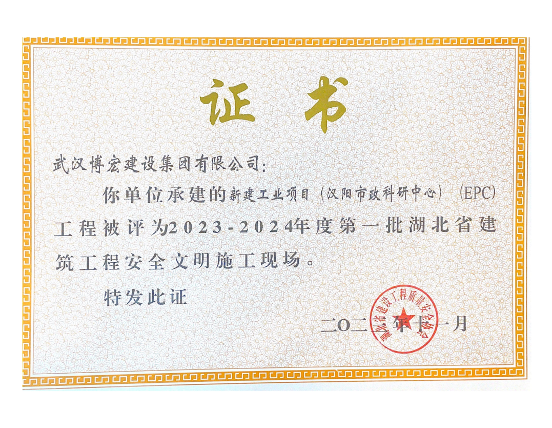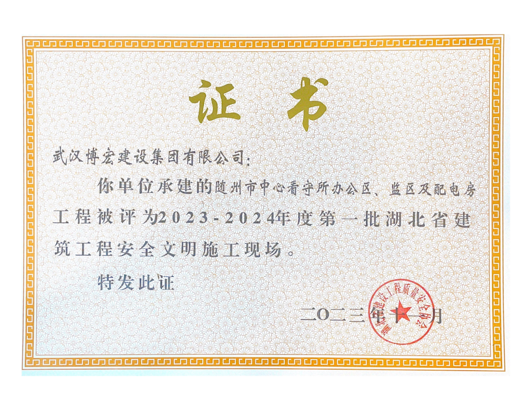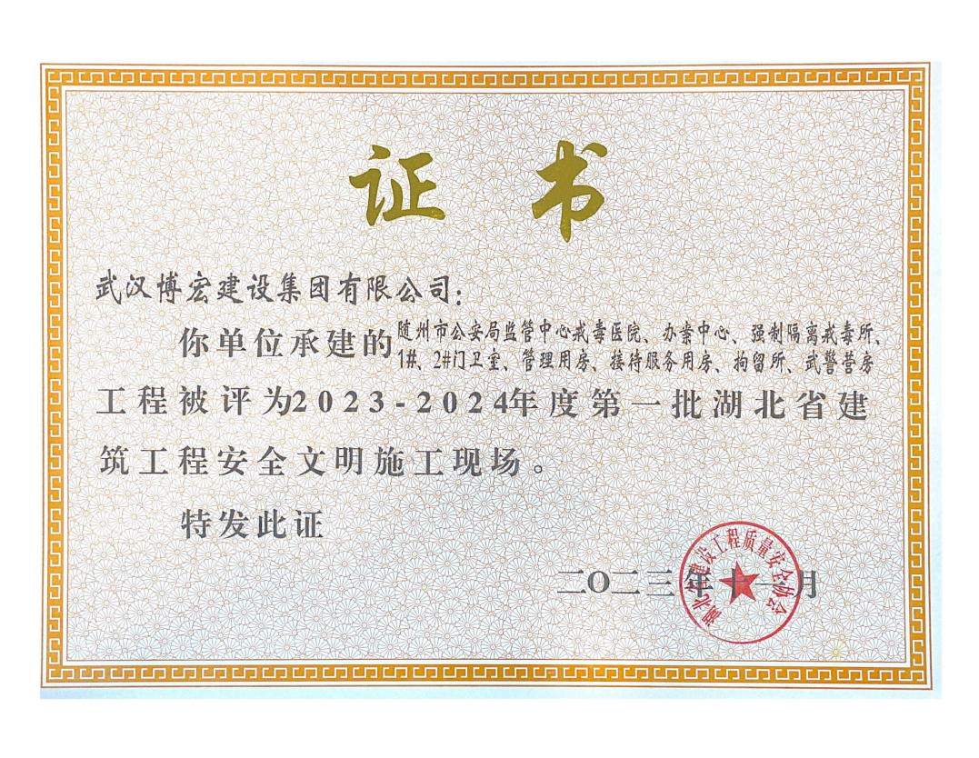 近日,湖北省建設(shè)工程質(zhì)量安全協(xié)會公布了2023-2024年度第一批湖北省建筑工程安全文明施工現(xiàn)場名單,由博宏建設(shè)集團(tuán)承建的隨州市中心看守所辦公區(qū)、監(jiān)區(qū)及配電房;黃金口產(chǎn)業(yè)園商業(yè)設(shè)施、居住、公園綠地建設(shè)項目;新建工業(yè)項目(漢陽市政科研中心)(EPC)等8項工程獲評湖北省建筑工程安全文明施工現(xiàn)場。